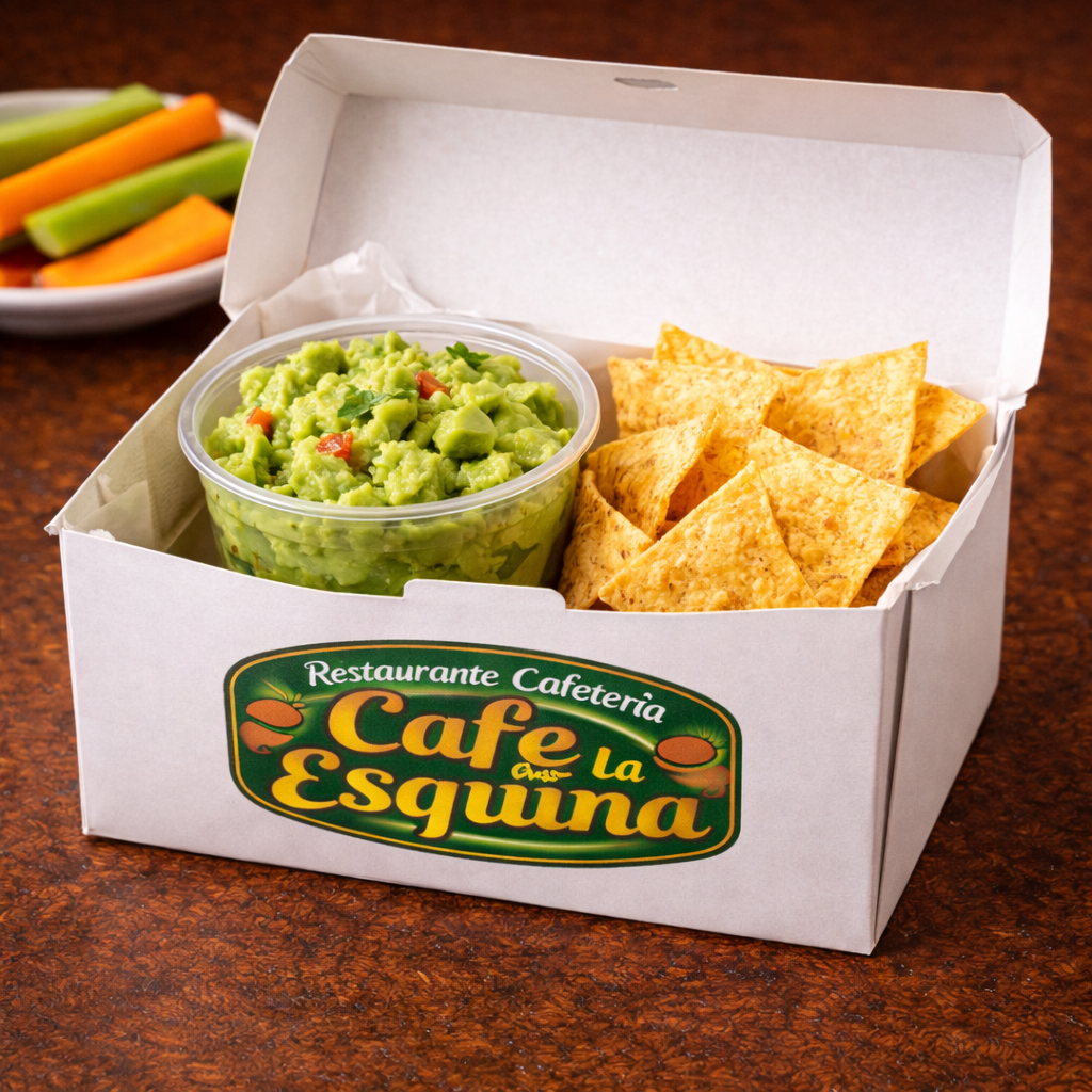 Disfruta nuestro guacamole fresco y cremoso, hecho con aguacates maduros, un toque de limón y especias naturales. Servido con chips de tortilla crujientes, ideal para picar, compartir o disfrutar como snack. Todo presentado en una práctica cajita para llevar con nuestro logo, manteniendo la frescura y el sabor en cada bocado. Perfecto para acompañar tu bebida favorita o como aperitivo en cualquier momento.